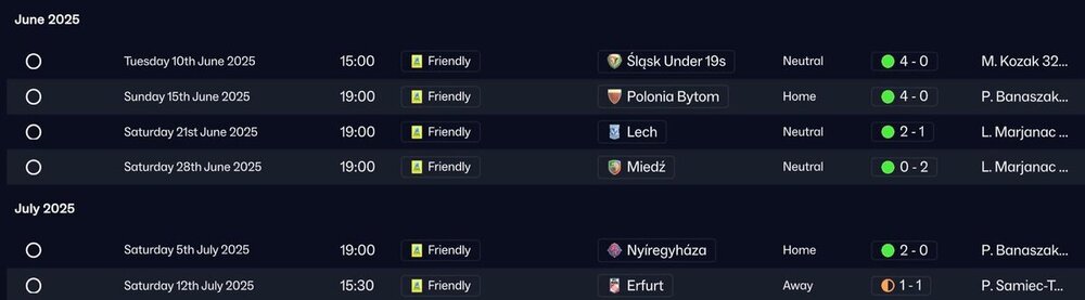Wrocław'ın Sesi Gazetesi Yaz Hazırlık Kampı Oldukça verimli bir yaz hazırlık kampı geçirdik. Açılışı 19 yaş altı kadromuzla bir hazırlık maçı oynayarak yaptık ve 4-0 sonuçlandı. Bu maç sayesinde hem as kadromu hem de takımdaki genç oyuncuları görmüş oldum. Sonrasında aynı ligde yer aldığımız Polonia Bytom ile kozlarımızı paylaştık. Bu maçtan da 4-0 üstünlükle ayrıldık. Kamptaki üçüncü maçımızda Ekstraklasa'nın şampiyonluk adaylarından biri olan Lech Poznań ile karşılaştık. Yakın geçen mücadelede rakibimizi 2-1 mağlup ettik ve geleceğe dair güçlü sinyaller verdik. Sonraki maçta yine aynı ligde yer aldığımız Miedź ile karşılaştık. Onları da tarafsız sahada 2-0 mağlup ettik ve hazırlık kampındaki güzel gidişatımızı sürdürdük. Son iki maçımız Macar ekibi Nyíregyháza ve Alman ekibi Erfurt'a karşı oldu. Birinden takım galip ayrılırken diğerinde ise maç beraberlik ile sonuçlandı. Temmuz & Ağustos 2025 Lige içeride Puszcza'yı konuk ederek başladık. Yakın geçen maçta Samiec-Talar'ın attığı tek golle 1-0 galip geldik ve lige üç puanla başladık. İkinci haftada ise Chrobry deplasmanına gittik. Oradan dört gollü galibiyet ile rahat bir şekilde döndük ve puanımızı altıya çıkardık. Sonrasında ise ligdeki ilk ciddi sınavımızı verdik. Ligin bizimle beraber şampiyonluk adaylarından biri olan Wisła Kraków'u içeride 3-1 mağlup ettik. Dördüncü haftada GKS Tychy ile deplasmanda karşılaştık ve onları da Chrobry maçındaki skorla mağlup ettik. Beşinci haftada rakibimiz hazırlık kampında da karşılaştığımız Polonia Bytom oldu ve onları içeride 2-0 yenerek beşte beş yapmış olduk. Bu maçtan üç gün sonra Znicz Pruszków deplasmanına gittik ve önceki maçın yorgunluğunun da nedeniyle 2-2 berabere kalarak ligdeki ilk puanımızı kaybettik. Yedinci haftada üst üste ikinci deplasman maçımıza çıktık ve Odra Opole'yi tek farkla mağlup ettik. Ağustos ayının son maçında ise yine hazırlık kampında karşılaştığımız Miedź ile karşı karşıya geldik. Bu sefer rakibimize diş geçiremedik ve maçtan golsüz beraberlik ile ayrıldık.